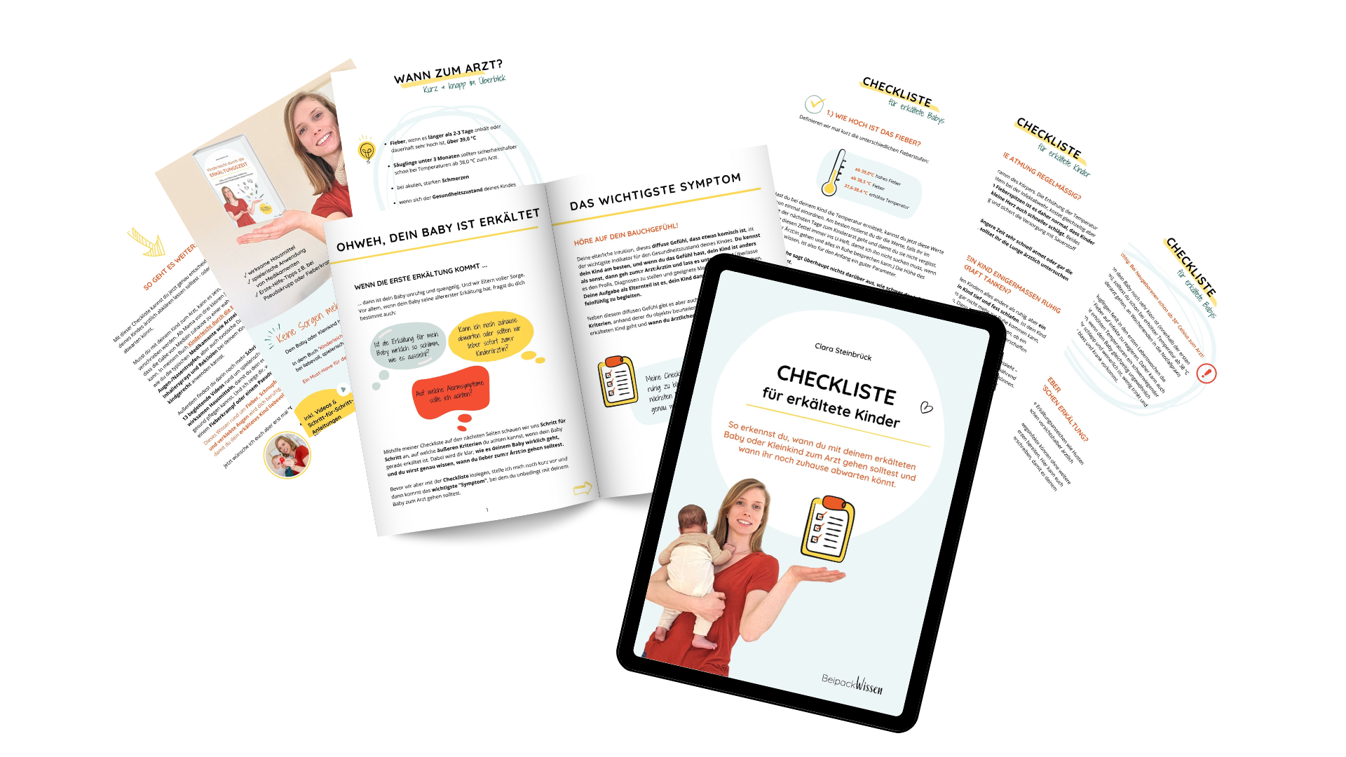- Eine Checkliste: Wann mit erkältetem Baby zum Arzt, mit deren Hilfe du genau erkennen kannst, wie es deinem fiebernden Baby geht und wann du zum Arzt gehen solltest. Oder ob du zuhause noch abwarten kannst.