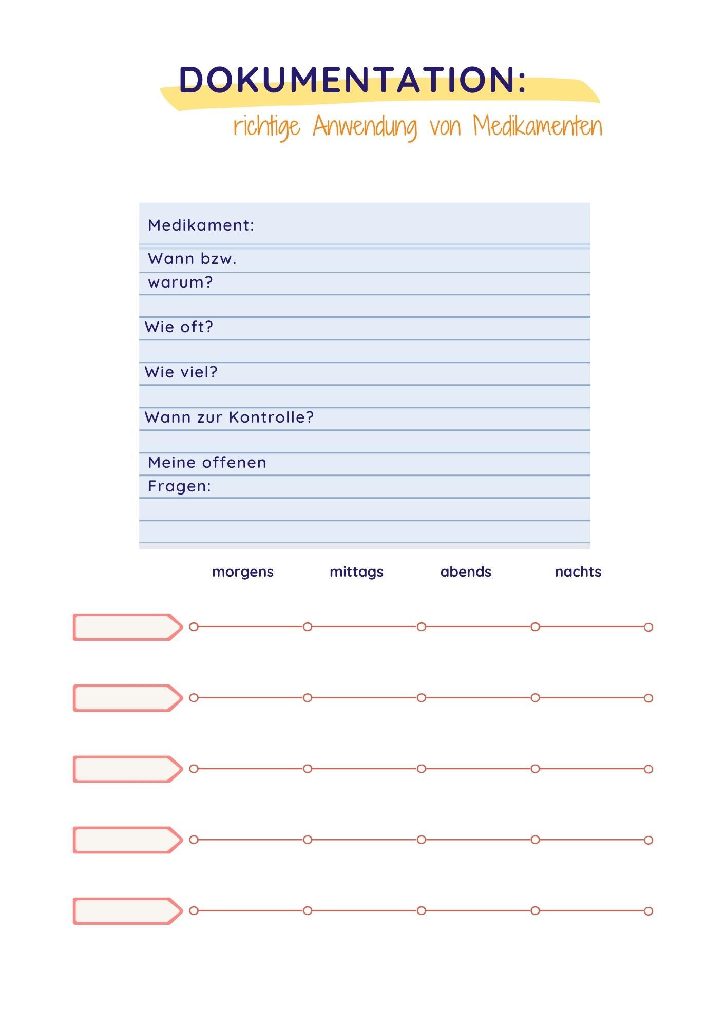 Darauf hast du Platz, um alle wichtigen Informationen über das Medikament und den zeitlichen Verlauf einzutragen.