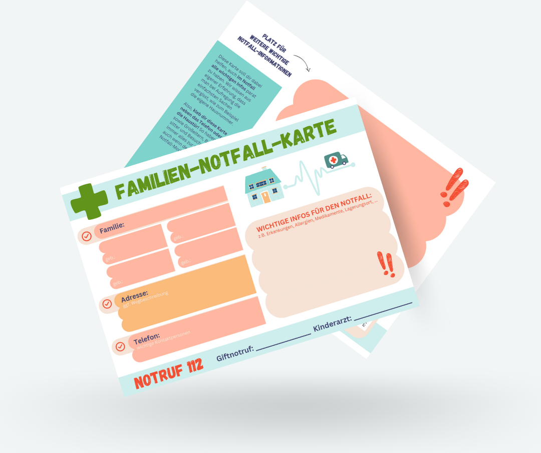 Also, kleb dir diese Karte neben das Telefon oder an die Haustür! So haben du, sowie Großeltern, Babysitter und Besucher, immer alle wichtigen Infos zur Hand, auch wenn der Kopf im Notfall-Modus ist!