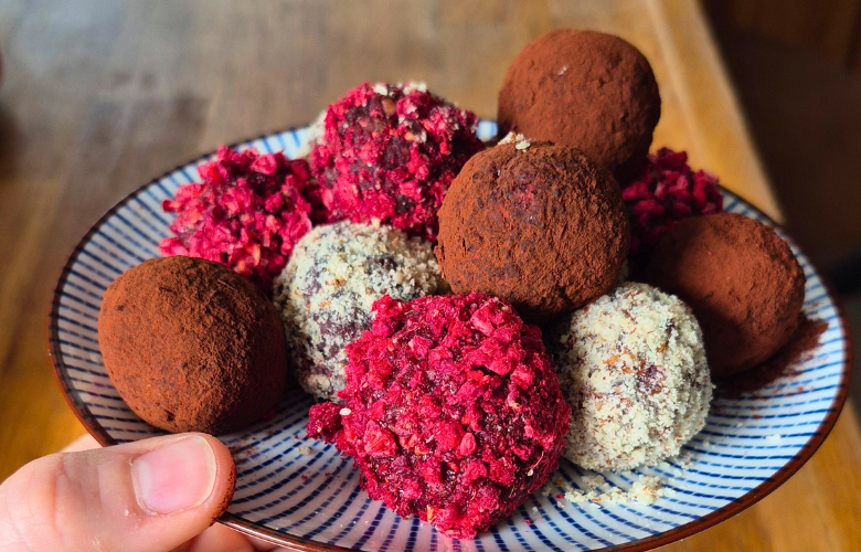 - Zum Wälzen: getrocknete Himbeeren (oder dunkler Kakao!)